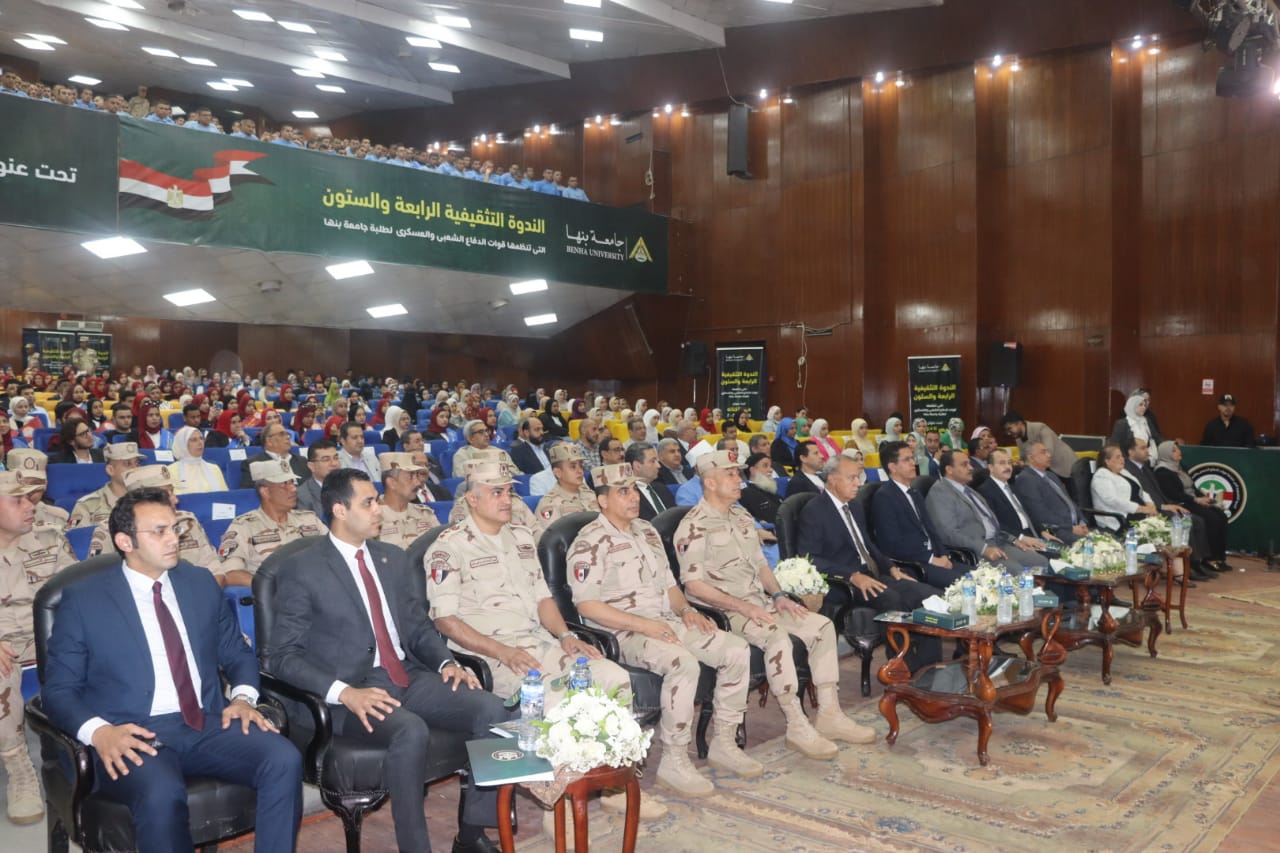 شهد اللواء عبد الحميد الهجان محافظ القليوبية ،واللواء وليد حامد الحماقى قائد قوات الدفاع الشعبى والعسكرى، والدكتور ناصر الجيزاوى رئيس جامعة بنها الندوة التثقيفية الرابعة والستون بجامعة بنها، والتى تنظمها قيادة قوات الدفاع الشعبى والعسكرى بالتعاون مع جامعة بنها.