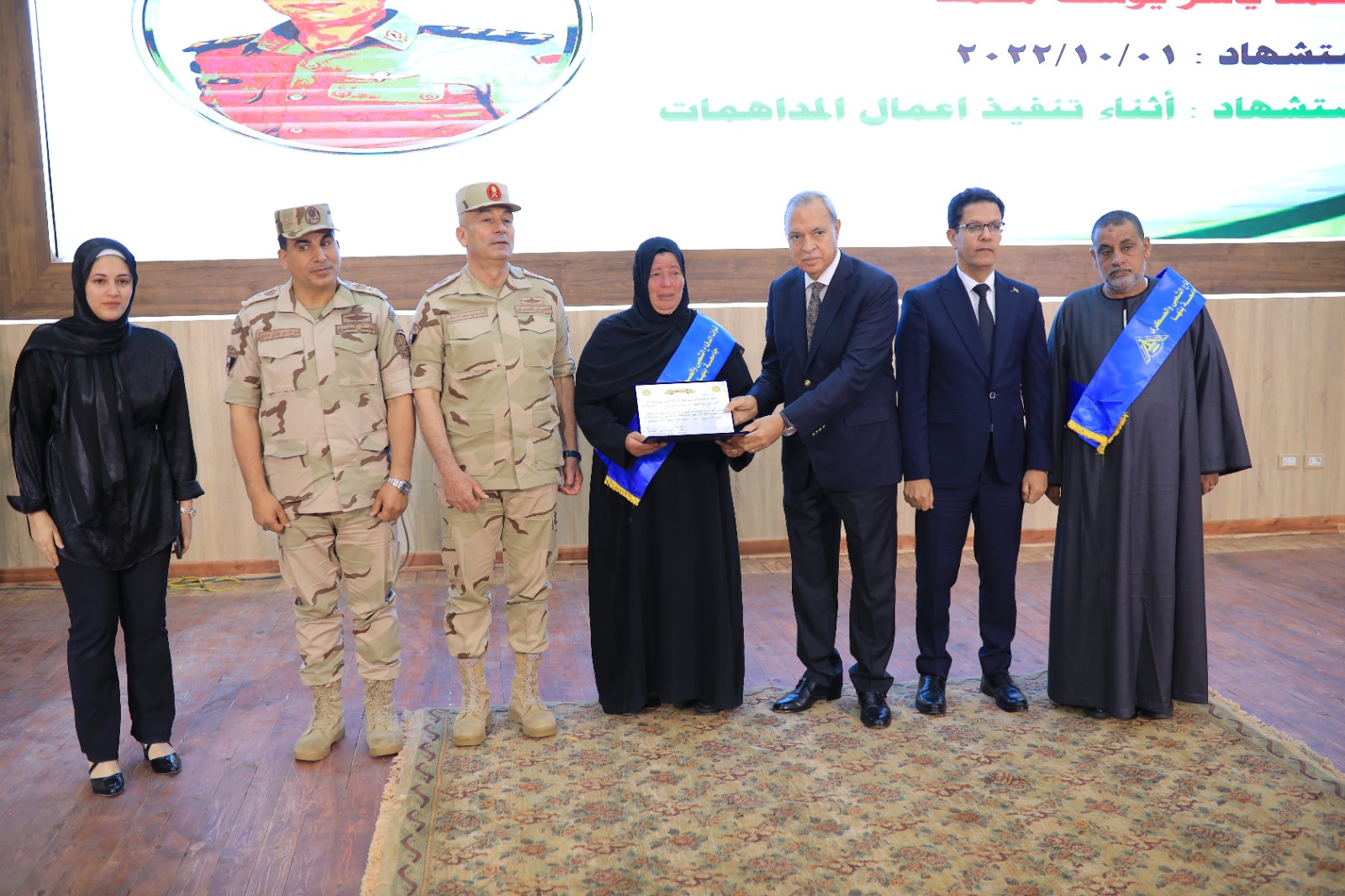 جاء ذلك بحضور الدكتور تامر سمير نائب رئيس الجامعة لشئون التعليم والطلاب، والدكتور السيد فودة نائب رئيس الجامعة لشئون خدمة المجتمع وتنمية البيئة ، والعميد محمد ثروت قائد التربية العسكرية بالجامعة وعمداء الكليات ،وأمين عام الجامعة ، والأمناء المساعدين ،وعدد من أسر الشهداء ، وطلاب الجامعة .