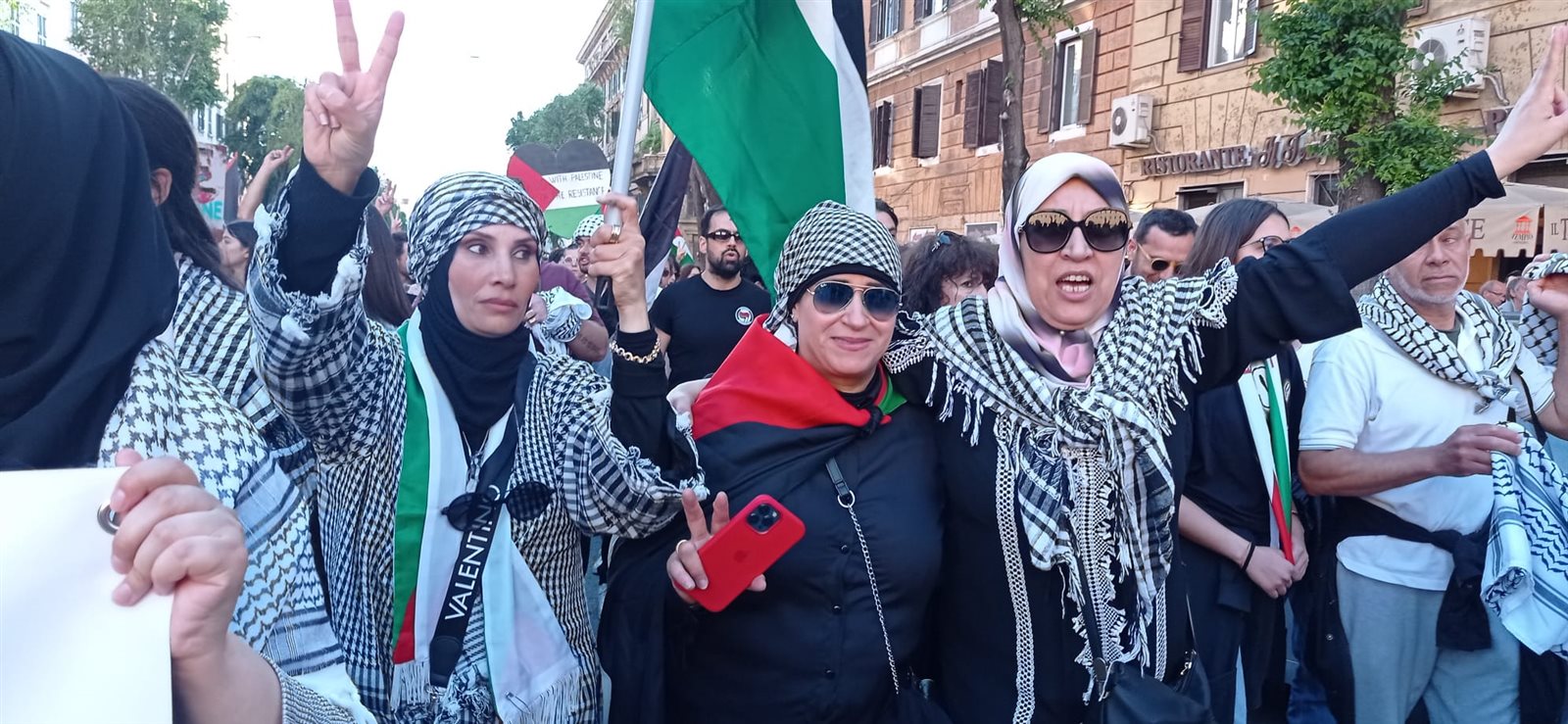 وكعادتها كانت المراة العربية في المقدمة حاملة أعلام فلسطين مرددة الهتافات المناصرة للشعب الفليسطيني وكانت في مقدمتهن السيدة " زينب محمد " رئيس مسجد الهدي في روما والتي باتت أيقونة المظاهرات المؤيدة لفليسطين في روما والناشتطان " رحاب عبد الفتاح " و" ناهد شوقي ".