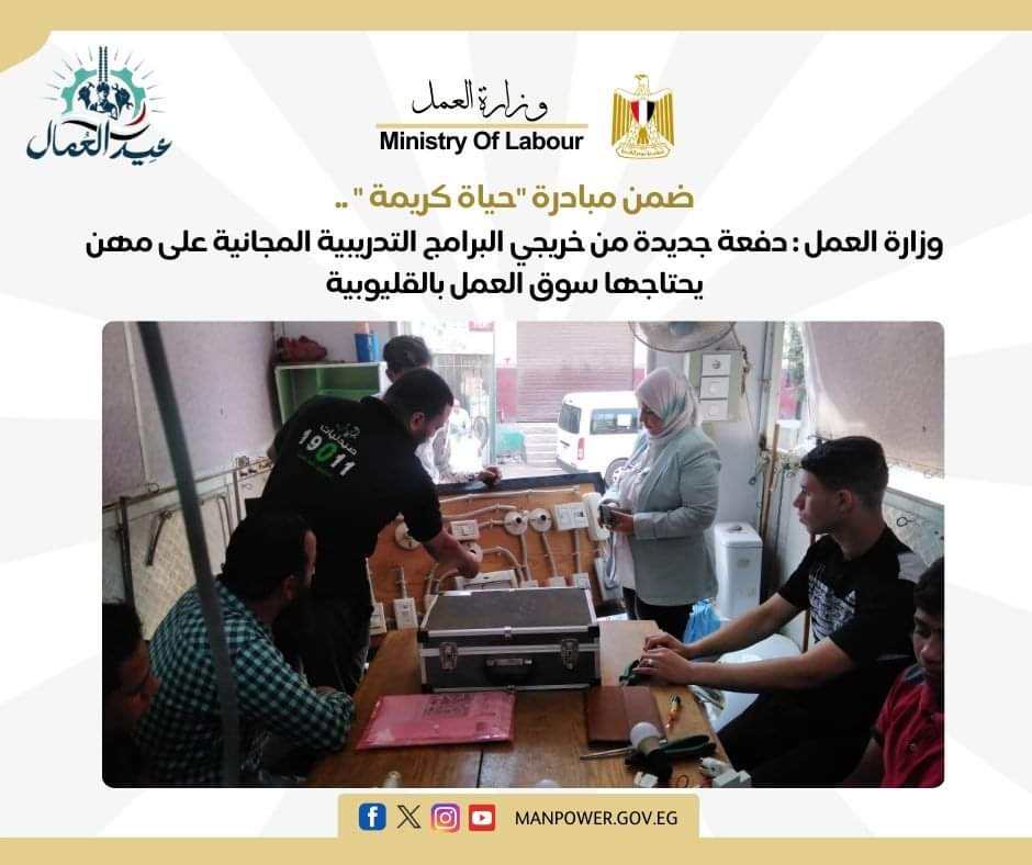 ضمن مبادرة مهنتك مستقبلك التى أطلقتها وزارة العمل لتدريب الشباب من الجنسين على المهن المطلوبة فى سوق العمل داخل المحافظات، تحت إشراف الإدارة المركزية للتدريب المهنى بالوزارة، وذلك بعد إنتهاء مدة التدريب المعتمدة بواقع عدد ساعات تدريبية خلال الدورة التدريبية بواقع 180 ساعة تدريبية بإجمالي 45 يومًا تدريبيًا، كما تتضمن التدريبات جوانب نظرية وعملية على أيدي مدربين متخصصين معتمدين من الوزارة.