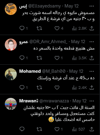 وسخر مجموعة كبيرة من الرجال على تويتر من سعر مايوه هادية غالب وجاءت التعليقات كالآتي، "والله جايب مايوه من 5 سنين بـ ٣٠ جنيهًا من المنشية ولسة ملعلع مع كل مصيف"، "السنة اللي فاتت كان في بـ ٣٠ هناك معرفش دلوقتي تلاقيه وصل ٧٠ مثلا، "هو السؤال الأهم مين الراجل اللي هيقبل على نفسه يلبس مايوه بالشكل ده أصلاً حتي لو ببلاش"، "أقوى دليل أن الستات مش فاهمين الرجالة"، "السنة اللي فاتت جبت ٢ ب ١٥٠ جنيهًا علشان كنت مستعجل ومسافر ولحد دلوقتي حاسس أنه اضحك عليا"، "دا أنا أجيبه من المنشية أحسن"، "ده بيعوم لوحده".