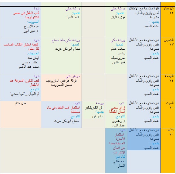 وفي اليوم الثاني: «فترة مفتوحة مع الأطفال قص ولزق والعاب متنوعة، يقدمها: هشام السعيد، ثم ورشة أعمال فنية تقدمها: د. أماني الشيخ، وورشة حكي ماما سماح تقدمها: سماح أبو بكرعزت، وورشة حكي: يقدمها: هيثم السيد الحكواتي».
