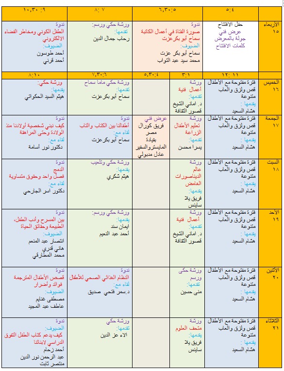 وفي سادس يوم: «فترة مفتوحة مع الأطفال قص ولزق والعاب متنوعة يقدمها: هشام السعيد، وورشة حكى ورسم تقدمها: منى حسين، وندوة النظام الغذائي الصحي للأطفال لقاء مع: د. سمر فتحي صديق، وندوة قصص الأطفال المترجمة فوائد وأضرار، بمشاركة مصطفى غنايم، وعاطف عبد المجيد»، وفي يومه السابع: «فترة مفتوحة مع الأطفال قص ولزق والعاب متنوعة يقدمها: هشام السعيد، وورشة متحف العلوم يقدمها: فريق يلا ساينس، ثم ورشة حكي تقدمها: آلاء عز الدين، وندوة كيف يدعم كتاب الطفل التفوق الدراسي لابنائنا، بمشاركة أحمد زحام، وعبد الرحمن نور الدين، ومنتصر ثابت».