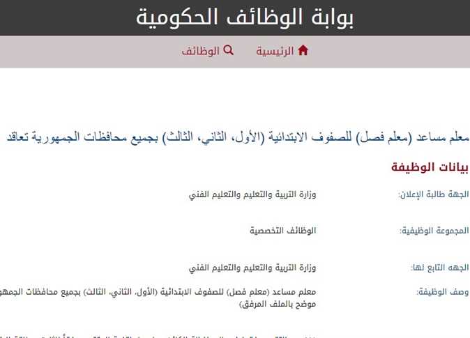 وتختص وظائف مسابقة التربية والتعليم بالمرحلة الابتدائية للصفوف الثلاثة الأخيرة (الرابع والخامس والسادس)، ويقتصر التقديم على الطريقة الإلكترونية عبر بوابة الوظائف الإلكترونية، ولن تقبل أى طلبات ورقية.