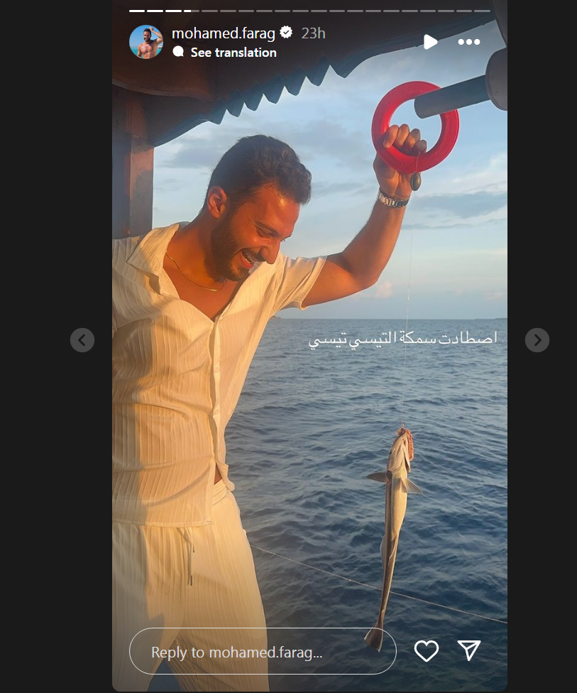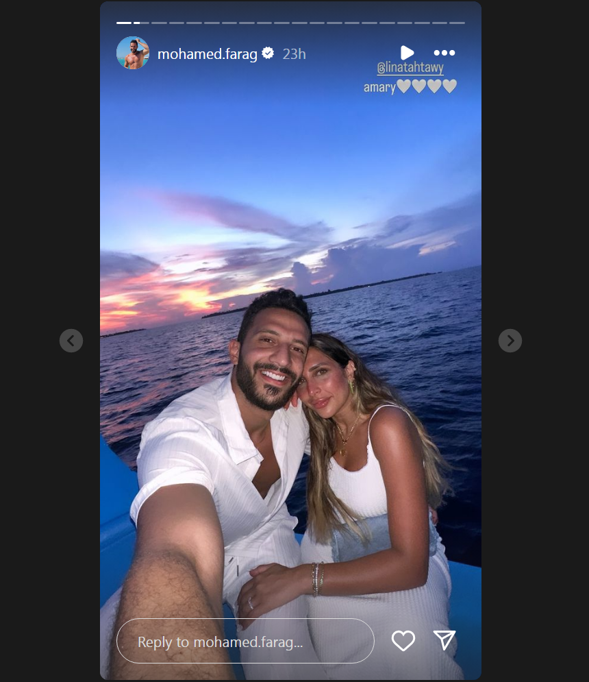 وفي صورة آخرى ظهرت لينا الطهطاوي بين ذراعي محمد فرج في أجواء رومانسية، ليشاهدون الغروب على أحد القوارب، مرتدين اللون الأبيض، فظهرت لينا بفستان مجسم مكشوف، وإرتدى محمد فرج قميص بنصف أكمام وبنطلون، وفي لقطة آخرى ظهر محمد فرج وهو يصطاد السمك، كما شارك متابعيه وجبة الإفطار على قارب صغير شكل القلب.