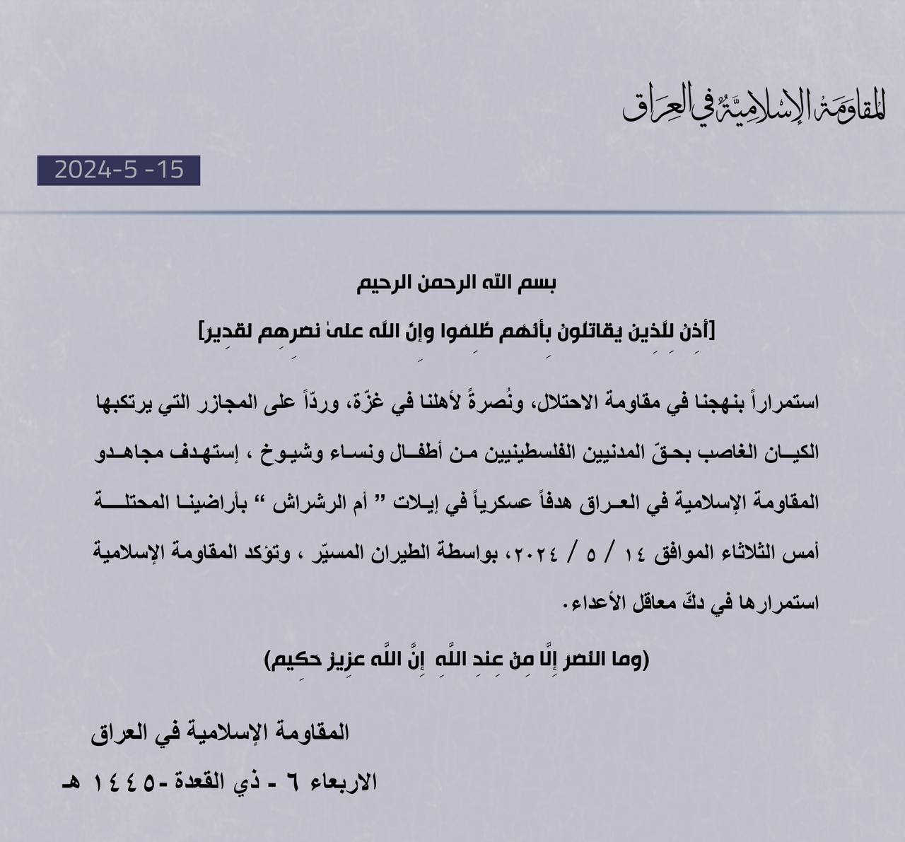 وقالت المقاومة العراقية في بيانها: استمرارًا بنهجنا في مقاومة الاحتلال، ونُصرةً لأهلنا في غزّة، وردًّا على المجازر التي يرتكبها الكيان الغاصب بحقّ المدنيين الفلسطينيين من أطفال ونساء وشيوخ، استهدف مجاهدو المقاومة الإسلامية في العــراق هدفاً عسكرياً في إيلات “ أم الرشراش ” بأراضينا المحتلــــة أمس الثلاثاء الموافق 14 / 5 / 2024، بواسطة الطيران المسيّر، وتؤكد المقاومة الإسلامية استمرارها في دكّ معاقل الأعداء.