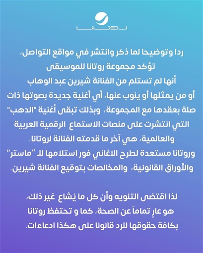 وجاء بيان روتانا كالآتي: "ردا وتوضيحا لما ذكر وانتشر في مواقع التواصل، تؤكد مجموعة روتانا للموسيقى أنها لم تستلم من الفنانة شيرين عبد الوهاب أو من يمثلها أو ينوب عنها، أي أغنية جديدة بصوتها ذات صلة بعقدها مع المجموعة".