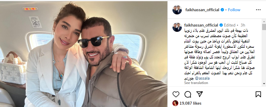 بادلت الفنانة أصالة زوجها الشاعر فائق حسن، بعبارت من الحب والغزل، بعد وصلة من الشعر التي كتبها الأخير لها عبر حسابه الخاص على موقع تبادل الصور والفيديوهات “انستجرام”.