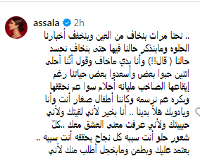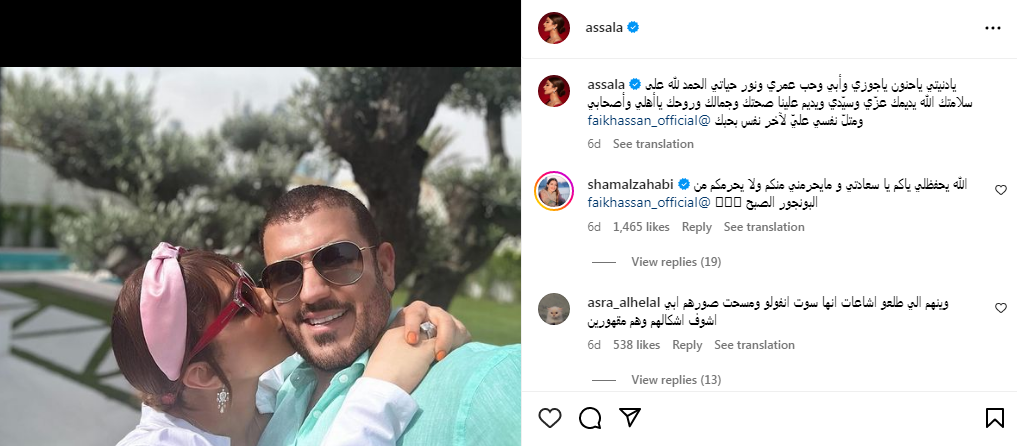 كانت قد انتشرت الأقاويل خلال الأيام القليلة الماضية خبر انفصال أصالة عن زوجها، بعد حذفها لصوره من على حسابها الرسمي عبر “انستجرام”، ومن هنا جاءت الاعتقادات بالانفصال في هدوء، لكن سرعان ما جاء الرد من أصالة بصورة قبلة بينها وبينه، وعلقت عليها قائلة “يادنيتي ياحنون ياجوزي وأبي وحب عمري ونور حياتي الحمد لله على سلامتك الله يديمك عزّي وسيّدي ويديم علينا صحتك وجمالك وروحك ياأهلي وأصحابي ومتلّ نفسي عليّ لآخر نفس بحبك”.