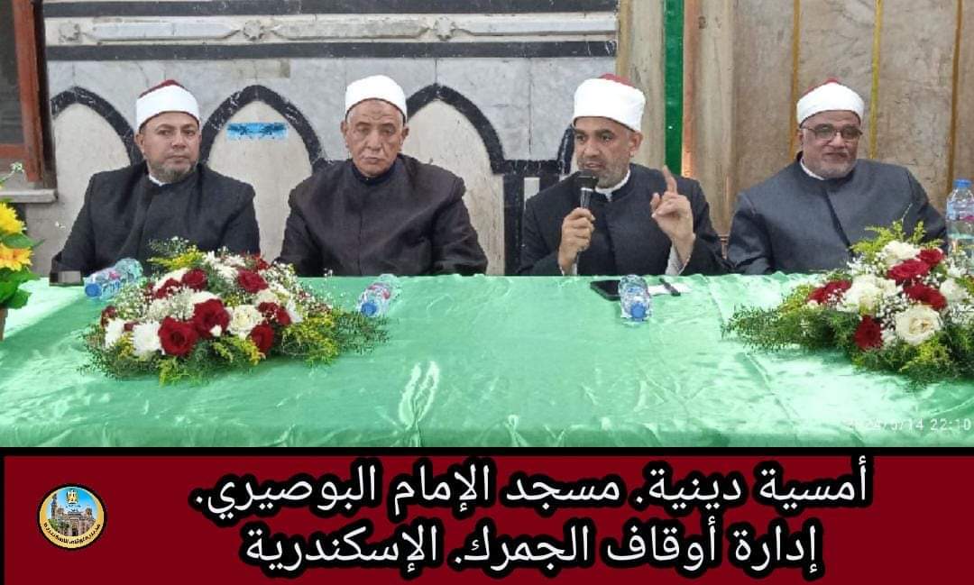 عقدت مديرية أوقاف الإسكندرية بالتعاون مع المجلس الأعلى للشئون الإسلامية الثلاثاء، أمسية دينية بمسجد الإمام البوصيري بميدان المساجد بالجمرك.