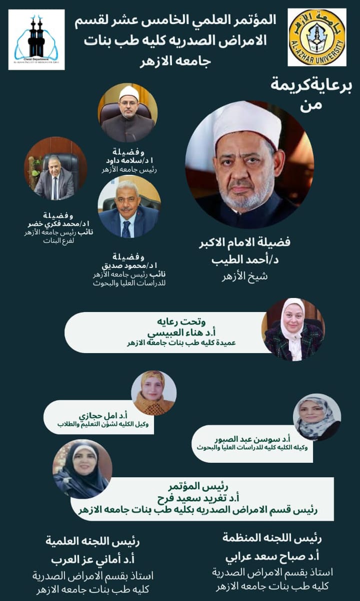 وأشارت "فرج" إلى أن المؤتمر السنوي للقسم يقام برعاية فضيلة الإمام الاكبر الدكتور أحمد الطيب، شيخ الأزهر الشريف، والدكتور سلامة جمعة داود، رئيس الجامعة، والدكتور محمود صديق، نائب رئيس الجامعة الدراسات العليا والبحوث المشرف العام علي قطاع المستشفيات، والدكتور محمد فكري خضر، نائب رئيس الجامعة لفرع البنات، والدكتورة هناء العبيسي، عميدة الكلية، والدكتورة سوسن عبد الصبور، وكيل الكلية الدراسات العليا والبحوث، والدكتورة أمل حجازي وكيل الكلية لشئون التعليم والطلاب.