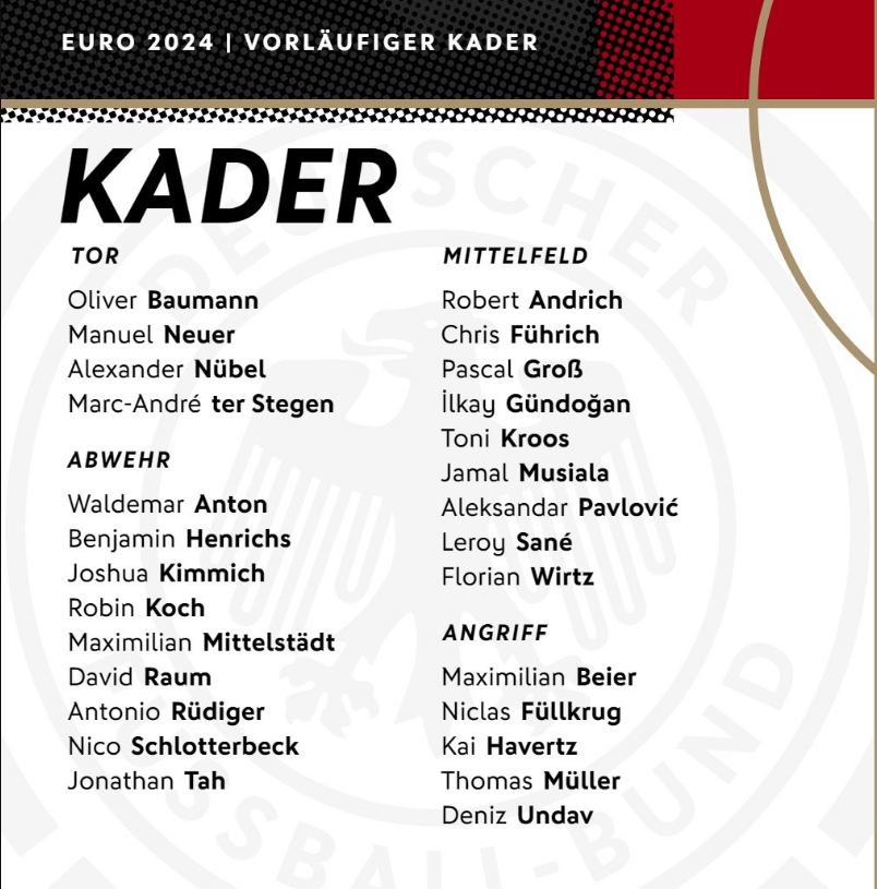 أعلن الجهاز الفني لمنتخب ألمانيا الأول لكرة القدم، بقيادة المدرب الوطني يوليان ناجلسمان، عن قائمة الماكينات النهائية التي ستشارك في بطولة كأس أمم أوروبا، يورو 2024، التي تنطلق يوم 14 يونيو المقبل وتستمر حتى 14 يوليو بمشاركة 24 منتخبًا وتستضيفها في ألمانيا.