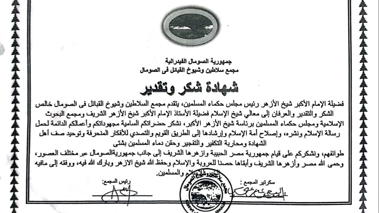 كما ثمّن «مجمع السلاطين وشيوخ القبائل بالصومال»، وقوف جمهورية مصر العربية وأزهرها الشريف إلى جانب جمهورية الصومال عبر مختلف العصور، داعين المولى عز وجل أن يحمي مصر وأزهرها الشريف، وأن يبقيها حصنا للعروبة والإسلام، وأن يحفظ شيخ الأزهر ويبارك فيه، وأن يوفقه إلى مافيه الخير للإسلام والمسلمين.