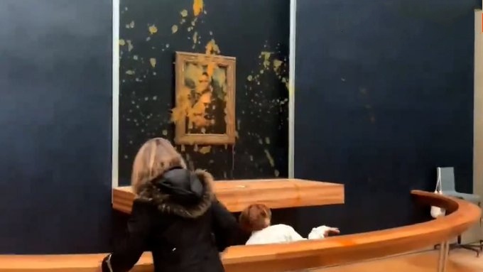 كما لطخ مجموعة من الأشخاص المهتمين بالبيئة، اليوم، لوحة الموناليزا في متحف اللوفر بباريس، حيث ألقى اثنان من نشطاء البيئة علبتين يبدو أنها صلصة طماطم على الزجاج المضاد للرصاص الذى يحمي لوحة ليونارد دافنشى الشهيرة، ثم تسلق الثنائي تحت حاجز المتحف ووقفا أمام الأعمال الفنية المتناثرة، بعد ذلك، خلعت إحدى الناشطات سترتها لتكشف عن قميص أبيض يحمل عبارة المجموعة البيئية "Riposte Alimentaire" مكتوبًا بأحرف كبيرة سوداء.