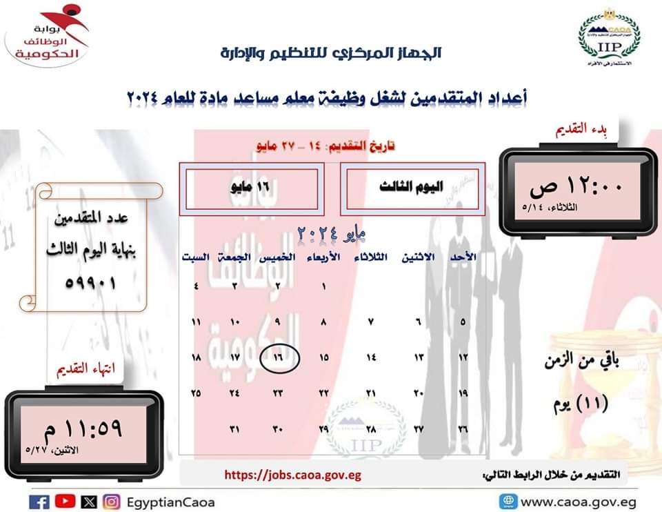 أعلن الجهاز المركزي للتنظيم والإدارة، برئاسة الدكتور صالح الشيخ، عن قيام ٥٩٩٠١ متقدمًا قاموا بالتقديم في مسابقة شغل 18886 وظيفة معلم مساعد مادة بوزارة التربية والتعليم والتعليم الفني، للصفوف الابتدائية (الرابع – الخامس - السادس)، حتى نهاية اليوم الثالث من فتح باب التقديم الذي بدأ 14 مايو الجاري ويستمر حتى يوم 27 من نفس الشهر، وذلك على موقع بوابة الوظائف الحكومية https://jobs.caoa.gov.eg .
