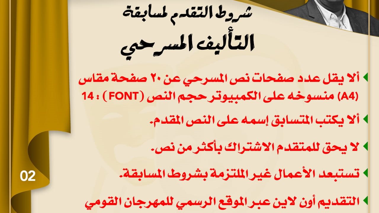 وجاءت شروط التقديم لمسابقة التأليف المسرحي كالتالي :
