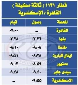 - تشغيل قطار 1131 ثالثة مكيفة القاهرة / الإسكندرية يومياً حيث يقوم من القاهرة الساعة 07:00 صباحاً يصل الإسكندرية الساعة 09:55 صباحاً طبقا للجدول المرفق .