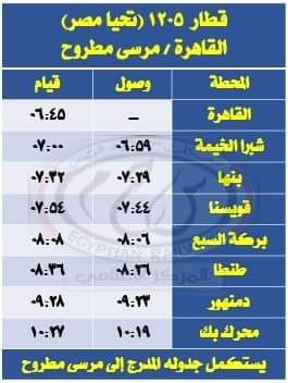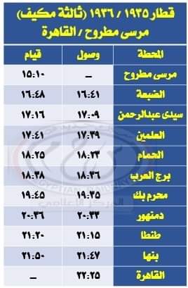 - تشغيل قطار 1935/1936 ثالثة مكيفة مرسي مطروح / القاهرة يومياً حيث يقوم من مرسي مطروح الساعة 03:10 مساءً يصل القاهرة الساعة 10:25 مساءً طبقا للجدول المرفق .