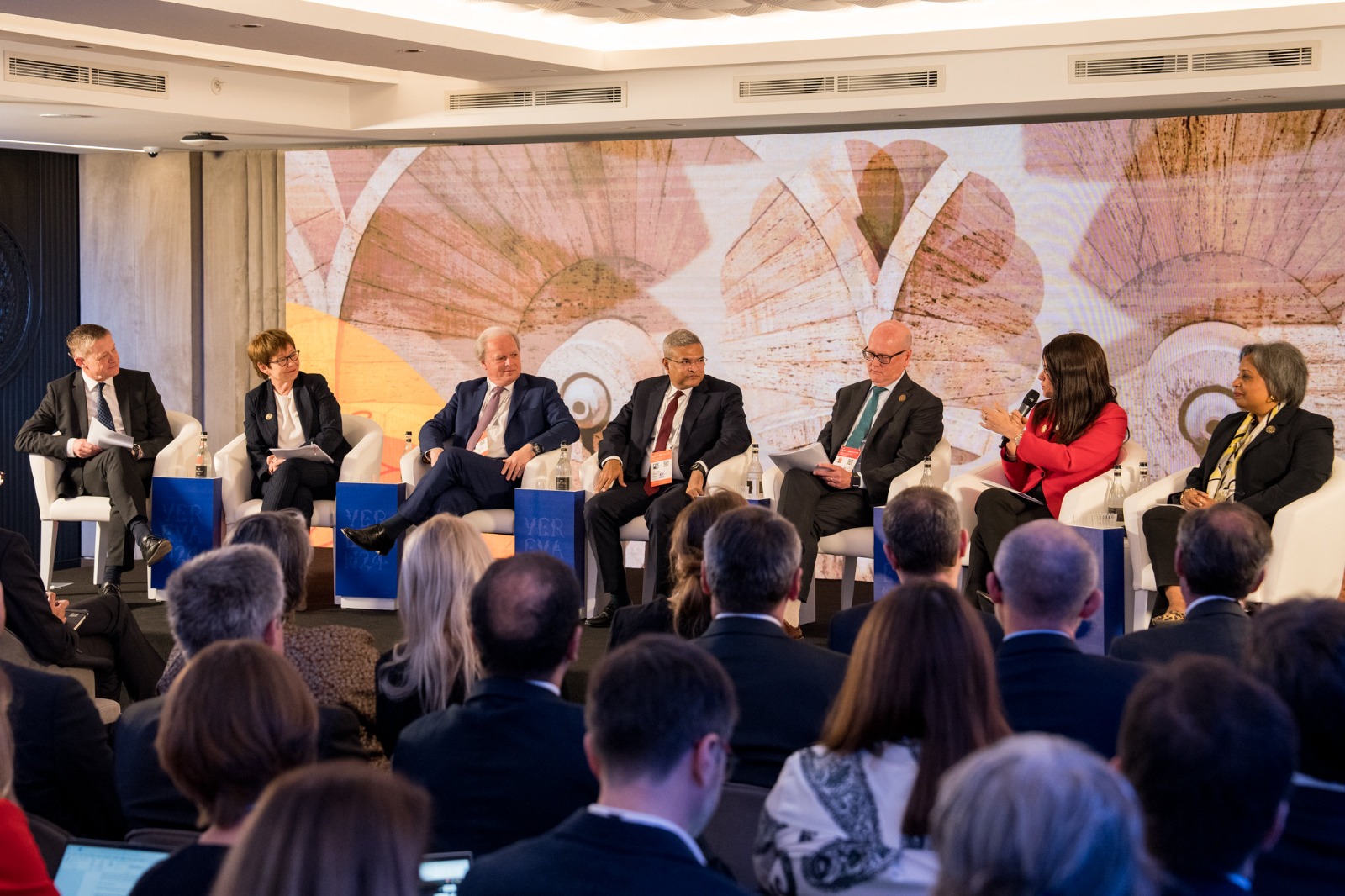 وشاركت وزيرة التعاون الدولي في جلسة رفيعة المستوى حول التكامل بين بنوك التنمية متعددة الأطراف، وذلك بحضور السيدة/ أوديل رينو باسو، رئيس البنك الأوروبي لإعادة الإعمار والتنمية، وأكسيل فان تروستنبرج، المدير المنتدب الأول للبنك الدولي المسؤول عن سياسات التنمية والشراكات، وتوماس أورستروس، نائب رئيس بنك الاستثمار الأوروبي، وبارجاف داسجوبتا، نائب رئيس البنك الآسيوي للاستثمار في البنية التحتية، ألكسيا لاتورتو، مساعد وزيرة التجارة الدولية والتنمية، وزارة الخزانة الأمريكية.