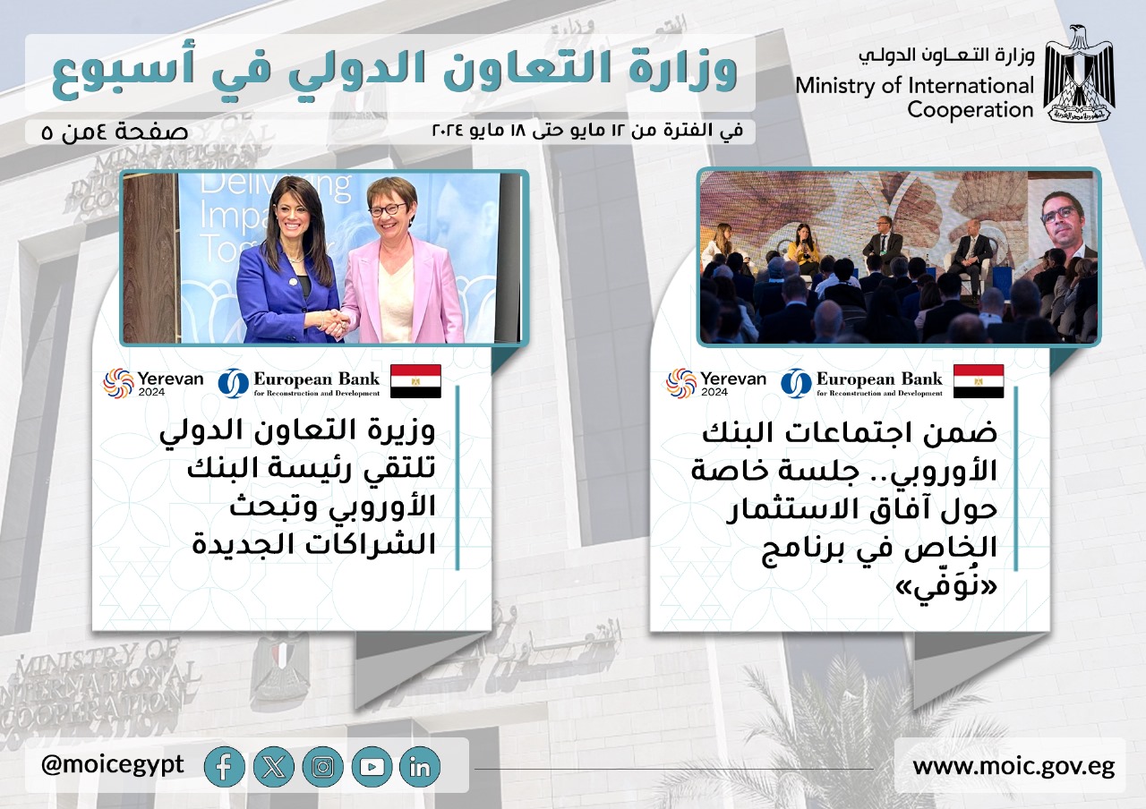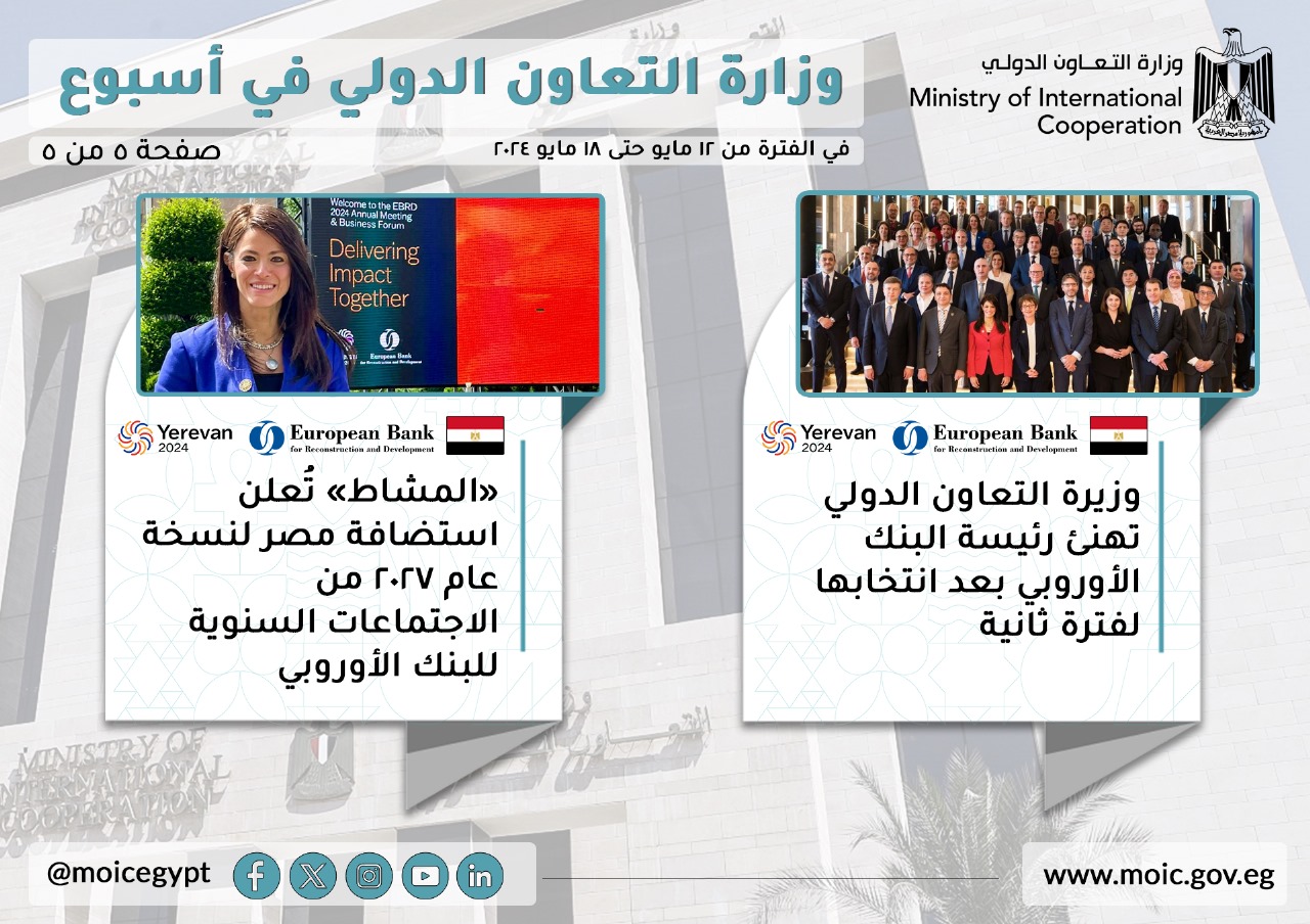 وشاركت وزيرة التعاون الدولي، بصفتها محافظ مصر لدى البنك الأوروبي لإعادة الإعمار والتنمية في الدورة 33 من الاجتماعات السنوية للبنك بالعاصمة الأرمينية «يريفان»، تحت شعار «معًا نُعزز الأثر»، حيث تم اختيار الوزيرة، نائبًا لرئيس الاجتماعات، التي شهدت مناقشات متعددة حول استراتيجية البنك الجديدة، وانتخاب رئيسة البنك لفترة ثانية، وتوسيع أعمال البنك في منطقة أفريقيا جنوب الصحراء.