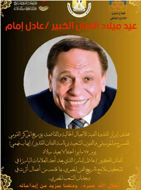 وفي هذا السياق، يحتفل المركز القومي للمسرح والموسيقى والفنون الشعبية، برئاسة الفنان إيهاب فهمي، بـعيد ميلاد الزعيم عادل إمام، الذي يحل اليوم الجمعة، الموافق 17 مايو من العام 1940، وذلك استمرارًا في التأريخ الموثق لذكرى ميلاد ووفاة الراحلين من القامات الفنية المصرية، وذكرى ميلاد الفنانين الحاليين المستمرين في عطائهم الفني، بهدف التعريف والتذكير بعظماء الفن المصري، وتخليد تلك الذكرى باعتبار هؤلاء المبدعين رموزًا وقدوة للأجيال الحالية والمقبلة.