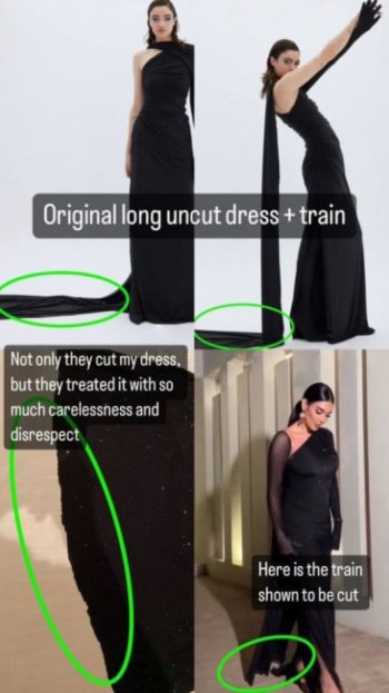 وبالرغم من رفض مصمم الأزياء التعديل على الفستان، قامت ياسمين ويُمنى بقص ذيله، وأطلت فيه ياسمين خلال فعاليات المهرجان دون ذيل، ثم أعادتاه إليه، دون أن تخبراه بالتعديل الذي عدلتاه على الفستان.