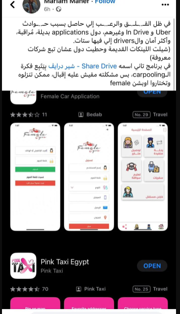 بعد التعرف على هذة التطبيقات، وجدت مجموعة كبيرة من السيدات أن هذه الشركات لا تغطي المحافظات كافة، ولذلك اقترحت مجموعة في مساعدة بعضهن عن طريق جروب أو أبلكيشن، فمن تمتلك سيارة يمكنها الكشف عن طريق سيرها وتصل من يكون في نفس طريقها.