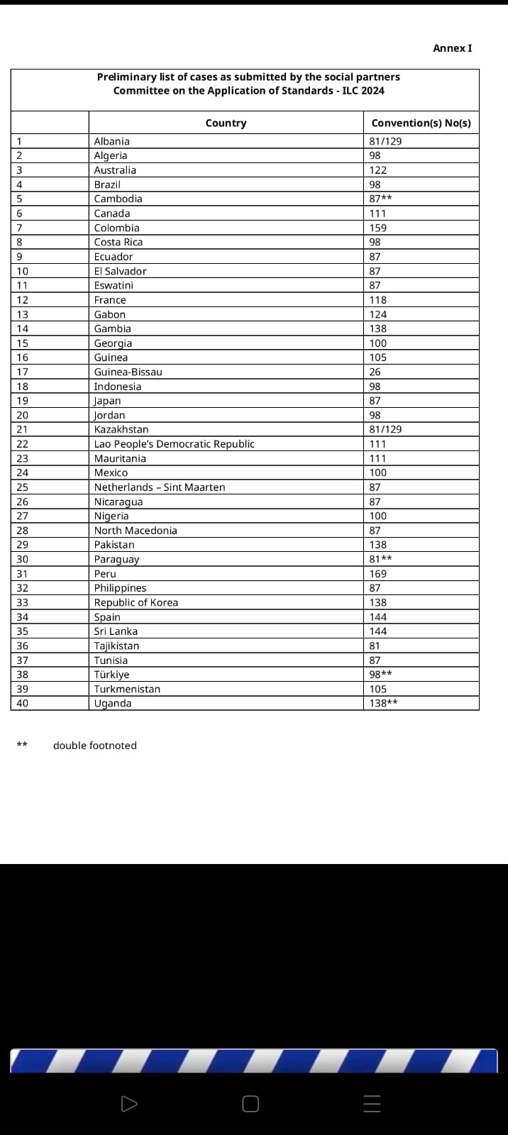 أعلن حسن شحاتة وزير العمل، اليوم الأحد، أن منظمة العمل الدولية التابعة للأمم المتحدة لم تُدرج مصر على قائمة الملاحظات الدولية المُقرر مُناقشتها خلال فعاليات الدورة 112 لمؤتمر العمل الدولي المُنعقد في جنيف مطلع الشهر المُقبل "يونيو 2024" بحضور مُمثلين عن 187 دولة حول العالم من "وزارات عمل وأصحاب أعمال وعمال".