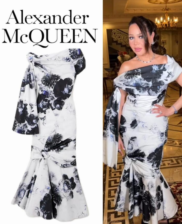 وظهرت أسما إبراهيم بفستان مجسم جذاب بصيحة الأوف شولدر، توقيع دار الأزياء ALEXANDER MCQUEEN وتميز بلونه الأبيض ومطبوع عليه بالورود السوداء، مع طيات في نهايته، مما عكس رشاقتها وقوامها الممشوق، وبلغ سعر الفستان 3667 يورو، أي ما يعادل 186 ألف جنيه.
