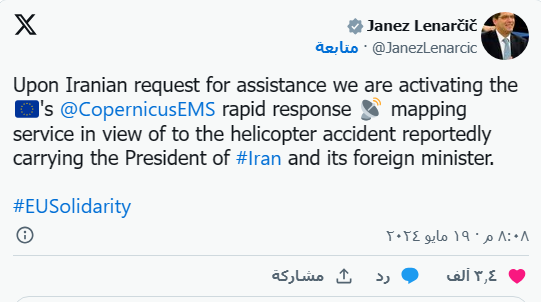 وأوضح المفوض الأوروبي المسؤول عن إدارة الأزمات يانيز لينارسيتش عبر منصة "إكس": "بناء على طلب مساعدة من إيران، نفعل خدمة خرائط الاستجابة السريعة (كوبرنيكوس إي إم إس) التابعة للاتحاد الأوروبي بسبب حادث المروحية".