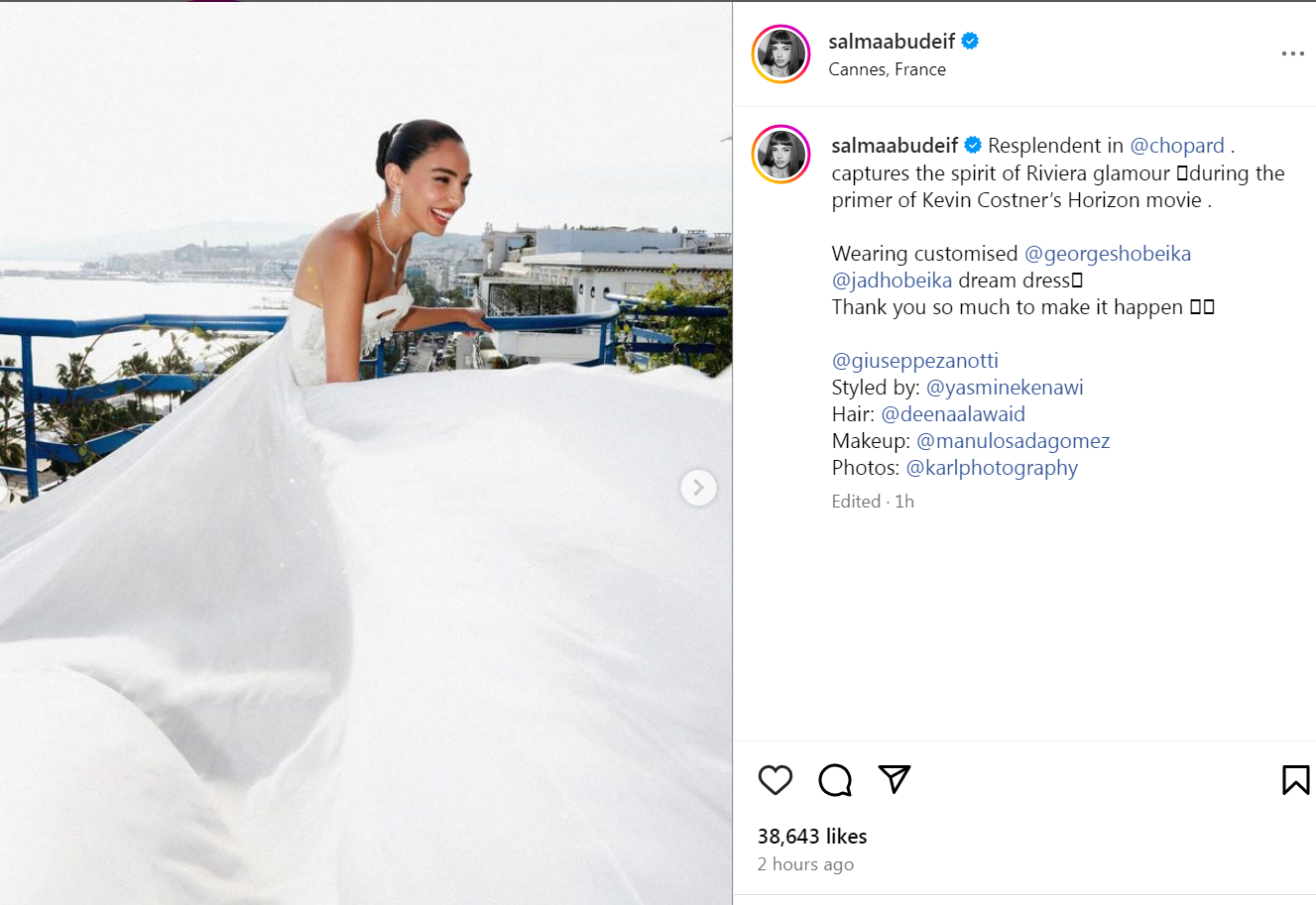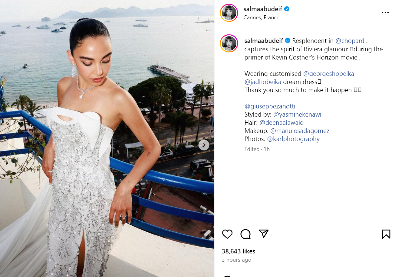 وبدت سلمى أبو ضيف بإطلالة ساحرة، تنتمي لذوق الطابع الأوروبي، أثناء خضوعها لجلسة تصوير جديدة في فرنسا، حيث ارتدت فستان أبيض مثير التصميم، ينتمي لقصة الكب، صمم من قماش الكريب المطرز بحبات الكريستال مع اللؤلؤ زين بذيل طويل مما جعله يشبه فساتين الزفاف المواكب لموضة 2024-2025؛ لتثير حالة من الجدل بعد إعلان خطوبتها من رجل الأعمال إدريس عبدالعزيز؛ ليظن جمهورها أنها لقطات حيه من حفل زفافها ولكنها علقت على الصور لتنهي الجدل، قائلة: " خلال العرض التمهيدي لفيلم Horizon للمخرج كيفن كوستنر".