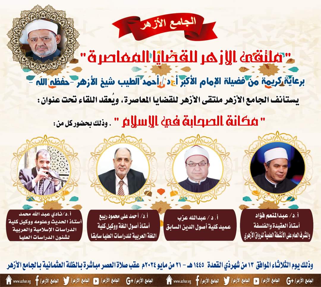 يواصل ملتقى "الأزهر للقضايا المعاصرة" بالجامع الأزهر الشريف، فعالياته الأسبوعية غدا الثلاثاء ، تحت عنوان: " مكانة الصحابة في الإسلام"، وذلك تحت رعاية فضيلة الإمام الأكبر الدكتور أحمد الطيب شيخ الأزهر الشريف، وبتوجيهات من الدكتور محمد الضويني وكيل الأزهر، وإشراف الدكتور عبد المنعم فؤاد، المشرف العام على الرواق الأزهري، والدكتور هاني عودة، مدير عام الجامع الأزهر.