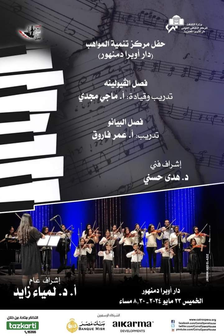 تقيم دار الأوبرا برئاسة الدكتورة لمياء زايد، حفلا للدارسين بمركز تنمية المواهب بأوبرا دمنهور تحت إشراف الدكتورة هدى حسني فصل الفيولينة تدريب وقيادة ماجى مجدى ويصاحبه عازف البيانو  أمير عوض وفصل البيانو تدريب عمر فاروق وذلك فى الثامنة والنصف مساء الخميس 23 مايو على مسرح أوبرا دمنهور ، ضمن توجهات الثقافة المصرية لتشجيع ودعم الواعدين.