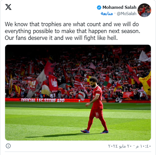 وقال صلاح في رسالته عبر حسابه على منصة إكس للتغريدات القصيرة :"نحن نعرف أن البطولات هي الأمر الهام، ونحن سنقوم بكل شيء ممكن لتحقيق ذلك الموسم المقبل".