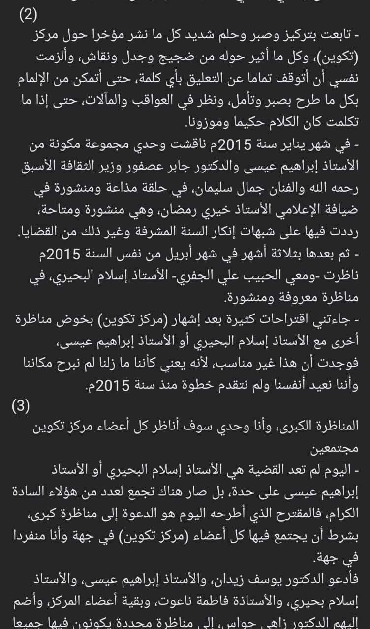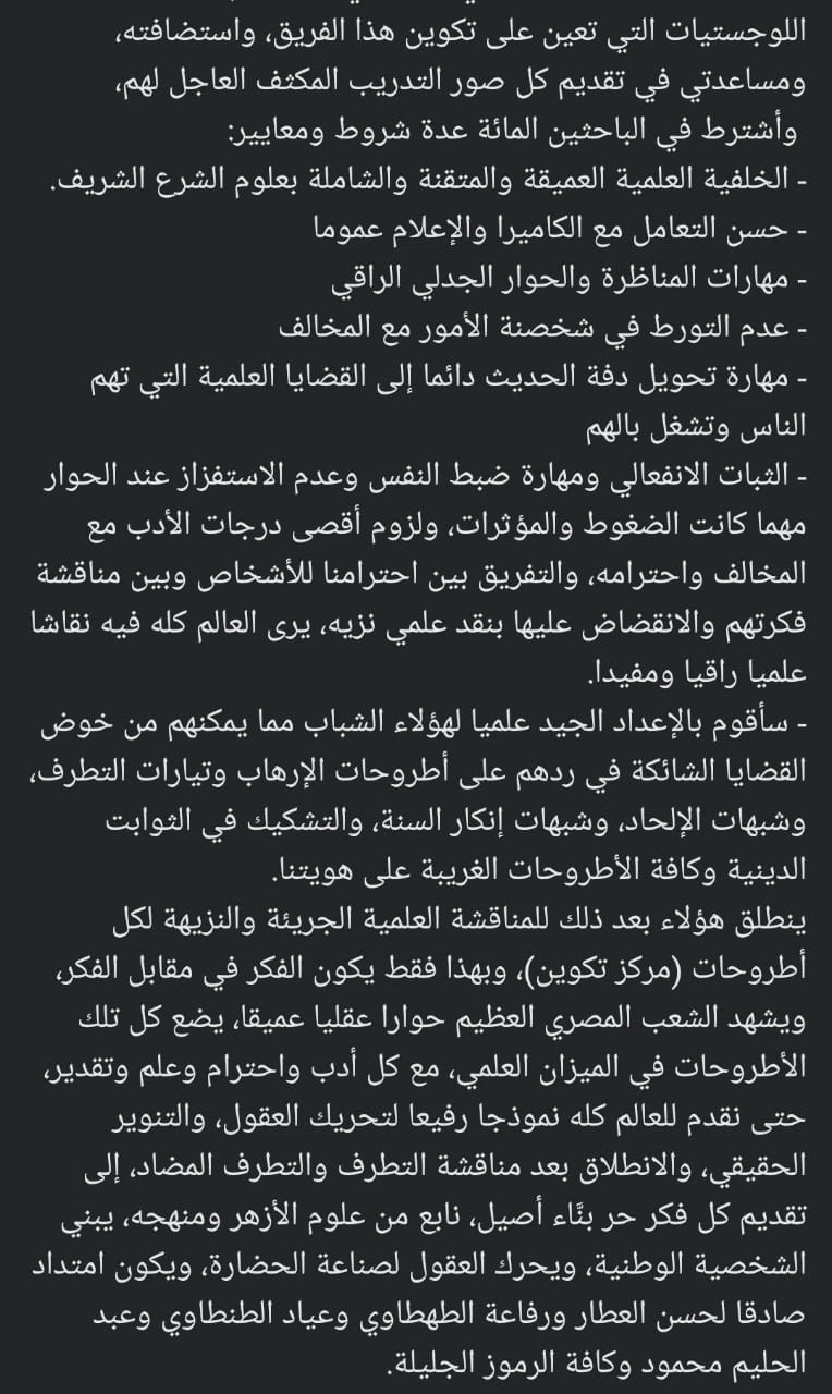 وتابع البيان عدة جوانب حول مايدعو إليه مركز تكوين والقائمين على تأسيسه لما فيه من أصوات تنادي بأفكار تنافي الطبيعية المصرية، كما طلب الأزهري بمناظرة وحوار مشترك يجمعه بجميع أعظاء هذا المركز.