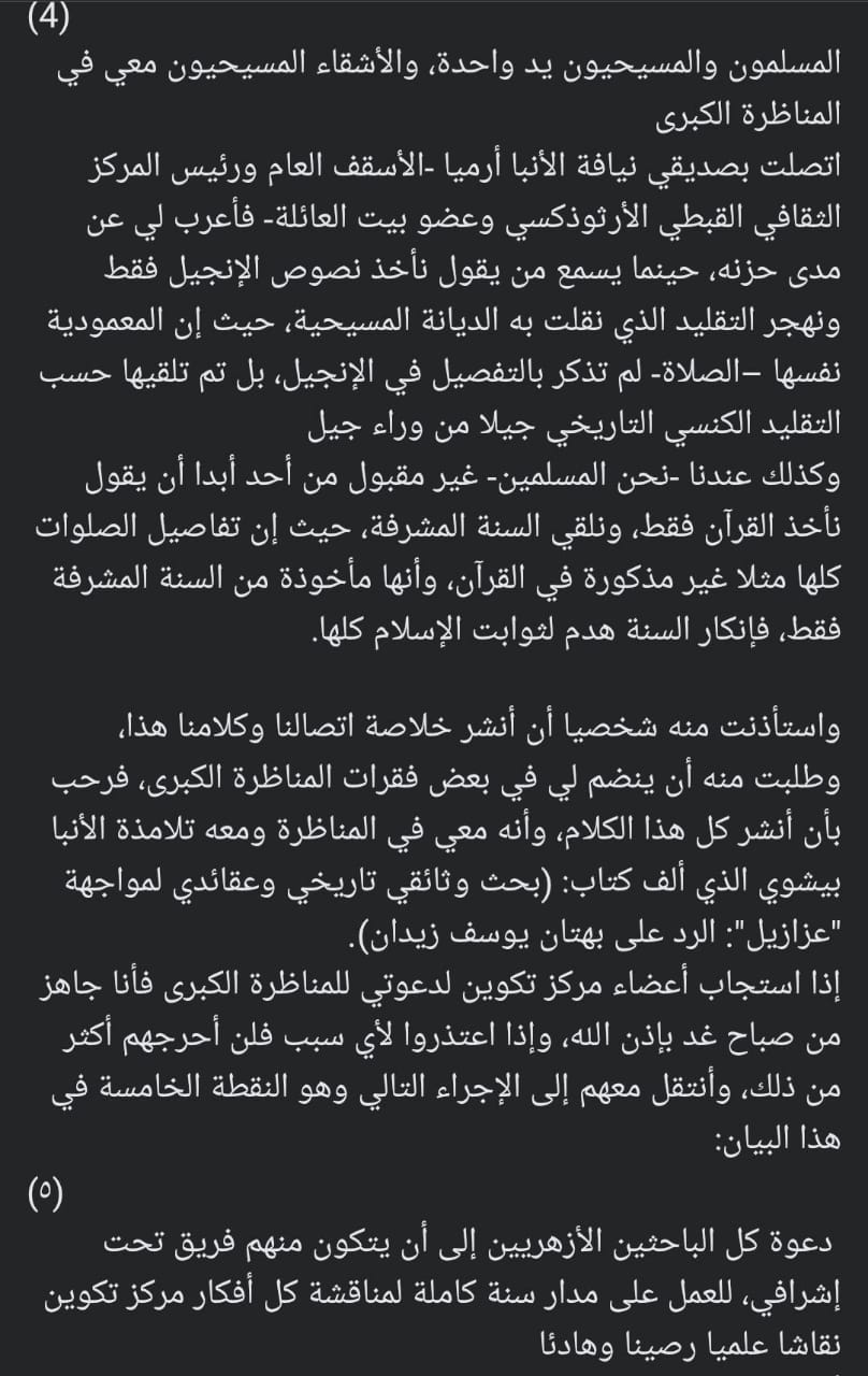 أعلن رئيس المركز الثقافي القبطي الأرثوذكسي على اتفاقهما بأهمية حفظ الثوابت الدينية دون أي تغيير ورفضهما نبرات إنكار السنة أو التقليد الكنسي، وجء نص البيان :" أننا نسعى جميعًا للحفاظ على الثوابت الدينية كما تسلمناها، دون أي تغيير، ونرفض بشدة ولا نقبل إنكار السنة المشرفة والتقليد الكنسي السابق للكتاب بعهديه القديم والجديد الذي نقل لنا كل ما يحدث في المسيحية من شعائر وصلوات…الخ".