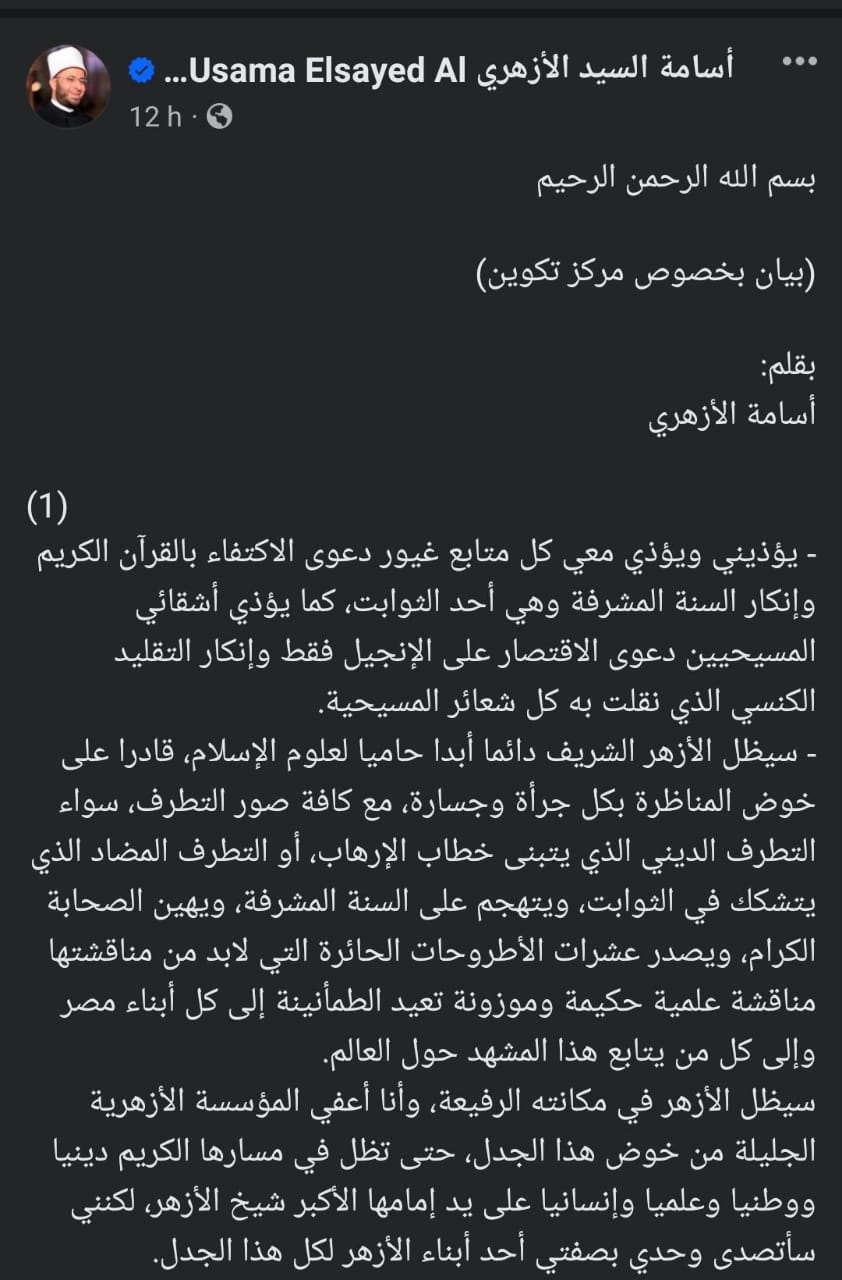 كان الدكتور أسامة الأزهري، قد أصدر مساء أمس البيان الأول له ردا على تدشين مركز تكوين للفكر العربي، ونص :"يؤذيني وويؤذي معي كل متابع غيور دعوى الاكتفاء بالقرآن الكريم وإنكار السنة المشرفة وهي أحد الثوابت، كما يؤذي أشقائي المسيحيين دعوى الاقتصار على الإنجيل فقط وإنكار التقليد الكنسي الذي نقلت به كل شعائر المسيحية.