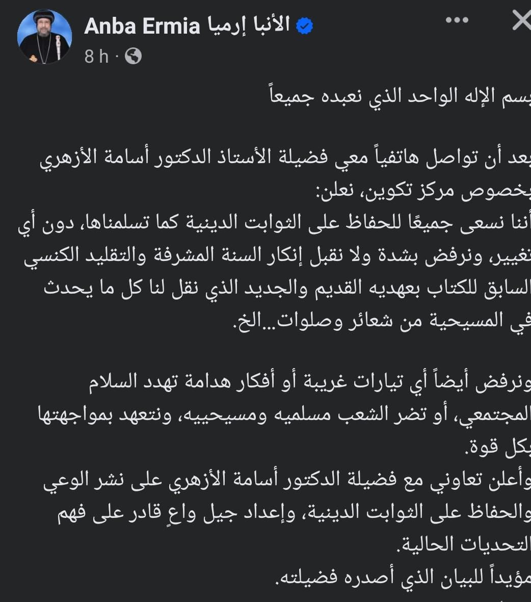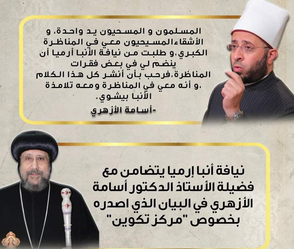 تداول الأقباط، خلال الساعات القليلة الماضية،كلمات نيافة الأنبا أرميا الأسقف العام رئيس المركز الثقافي القبطي الأرثوذكسي، و الأمين العام المساعد لبيت العائلة المصرية، التي تحدث فيها عن ماورد بينه وبين فضيلة الأستاذ الدكتور أسامة الأزهري،مستشار رئيس الجمهورية للشئون الدينية، بخصوص مركز تكوين خلال الإتصال الهاتفي.