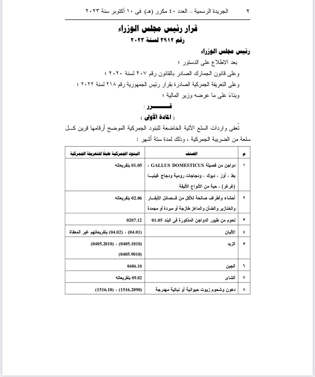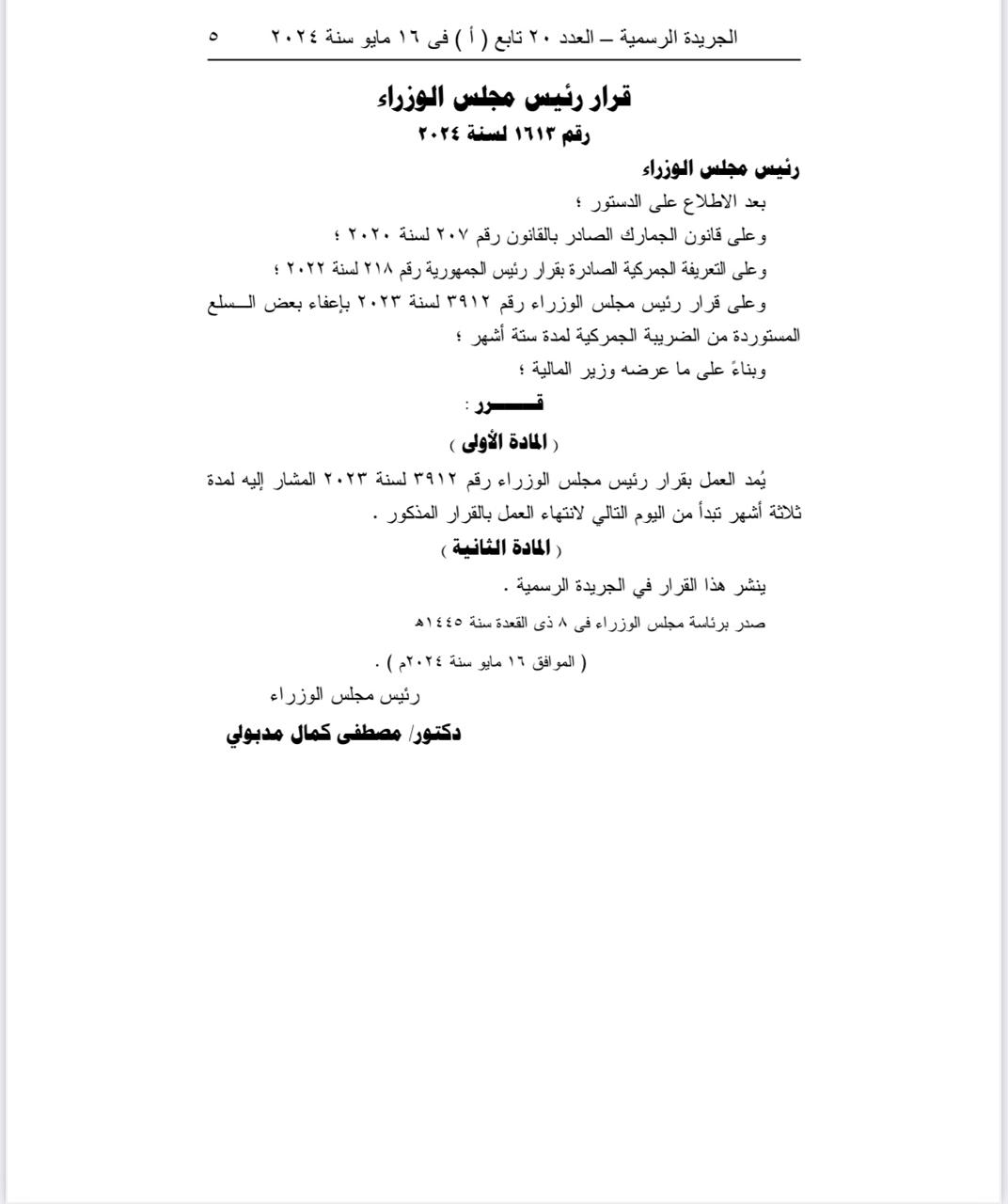 وأصدر الدكتور مصطفى مدبولي، رئيس مجلس الوزراء، قراره رقم 1613 لسنة 2024، الذي ينص على مد فترة إعفاء عددًا من السلع المستوردة والتي تضمنها القرار الصادر في أكتوبر الماضي لثلاثة أشهر إضافية وأبرزها السكر والدواجن ومنتجات الألبان والشاي من الضريبة الجمركية.