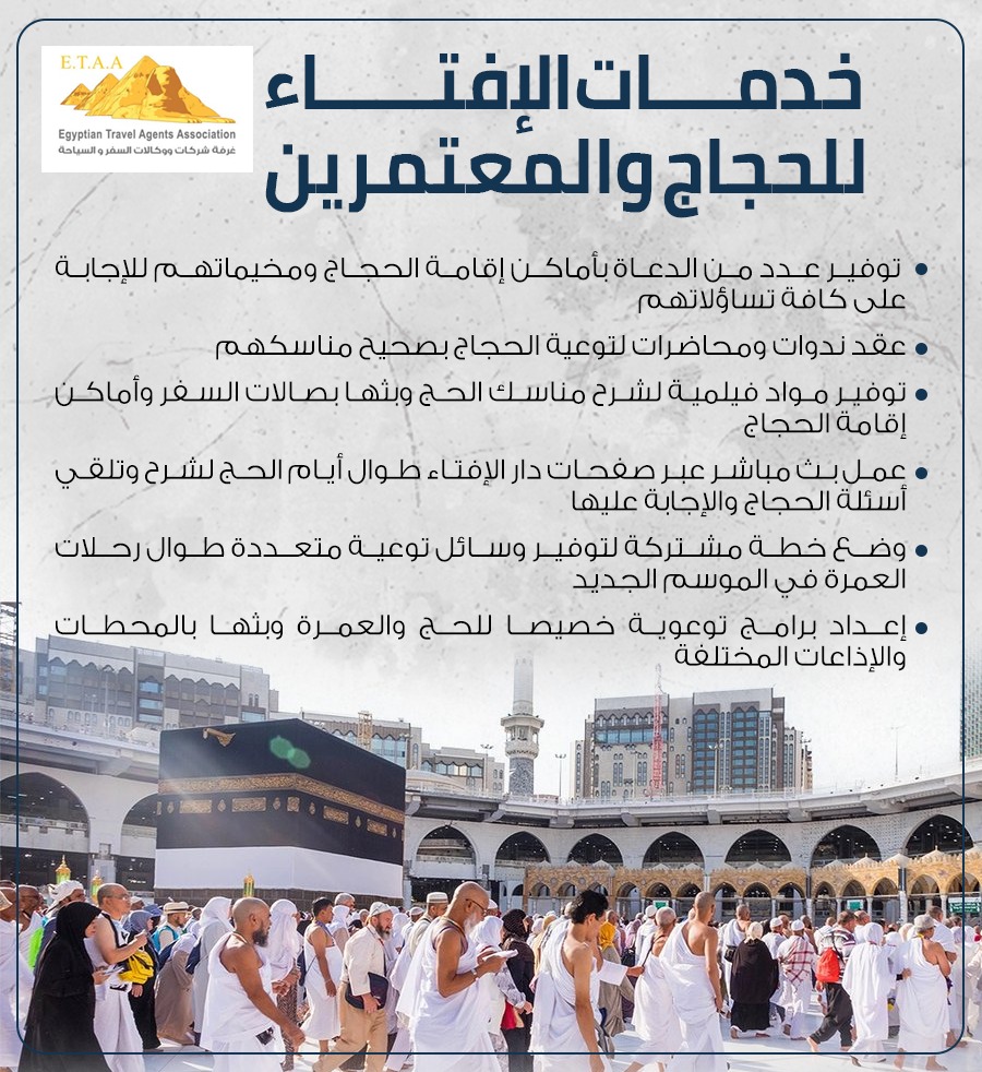 وقد اكد فضيلة الدكتور شوقي علام أن دار الإفتاء تقوم بالفعل بجهد كبير في شرح صحيح الدين فيما يخص مناسك الحج والعمرة ، وتستخدم في ذلك عدة أساليب دعوية منها المحاضرات المباشرة لعدد من العلماء وفي مقدمتهم المفتي ، وافلام كرتونية تشرح صحيح المناسك، بجانب الإجابة على كافة التساؤلات والاستفسارات التي تتلقاها الدار من الحجاج والمعتمرين ، مشددا علي استعداد دار الإفتاء لتقديم كافة أنواع الخدمات الدينية والتوعوية للحجاج والمعتمرين وتلبية طلبات قطاع السياحة في هذا الأمر لخدمة أكبر عدد من ضيوف الرحمن.