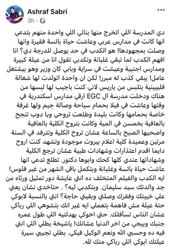 وكشف أشرف صبري المستور عن حياة ابنته ومستواها الدراسي قائلًا: " عاشت في فيلا بحمام سباحة وصالة جيم ولها غرفة خاصة بحمامها وكانت بليدة وطلعت روحي ويا دوب تنجح بالعافية بخمسين في المية وكانت بتروح الكلية بالعافية واصحيها الصبح بالساعة عشان تروح الكلية وتترفد في السنة مرتين وعميدة كلية اعلام بيروت موجودة وتشهد كنت اروح دايما اقدم اعتذارات وشهادات طبية عشان ترجع الكلية وشهاداتها عندي كلها كحك وابوها دكتور.. وتدعي انها عاشت حياة بائسة وغلبانة وبتكمل باقي الشهر من غير فلوس! ايه الكدب والفيلم المتخلف ده انتي عايشة دور تمثيل ورثاه من جد والدتك سيد سليمان.. وبتكدبي ليه؟ حتاخدي نشان يعني علي خيبتك وفقرك وصلتي وبقيتي حاجة؟".