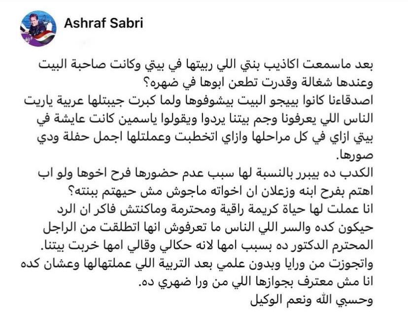 وأضاف أشرف صبري: " ياريت الناس اللي يعرفونا، وجم بيتنا يردوا ويقولوا ياسمين كانت عايشة في بيتي ازاي في كل مراحلها وازاي اتخطبت وعملتلها اجمل حفلة ودي صورها".