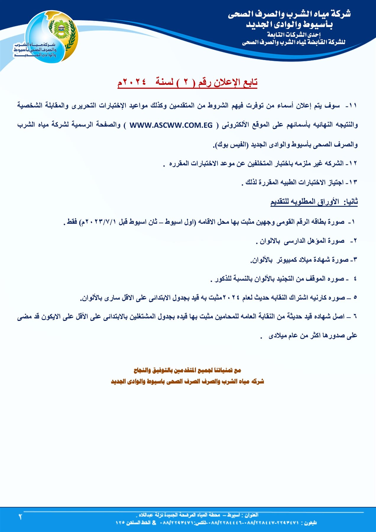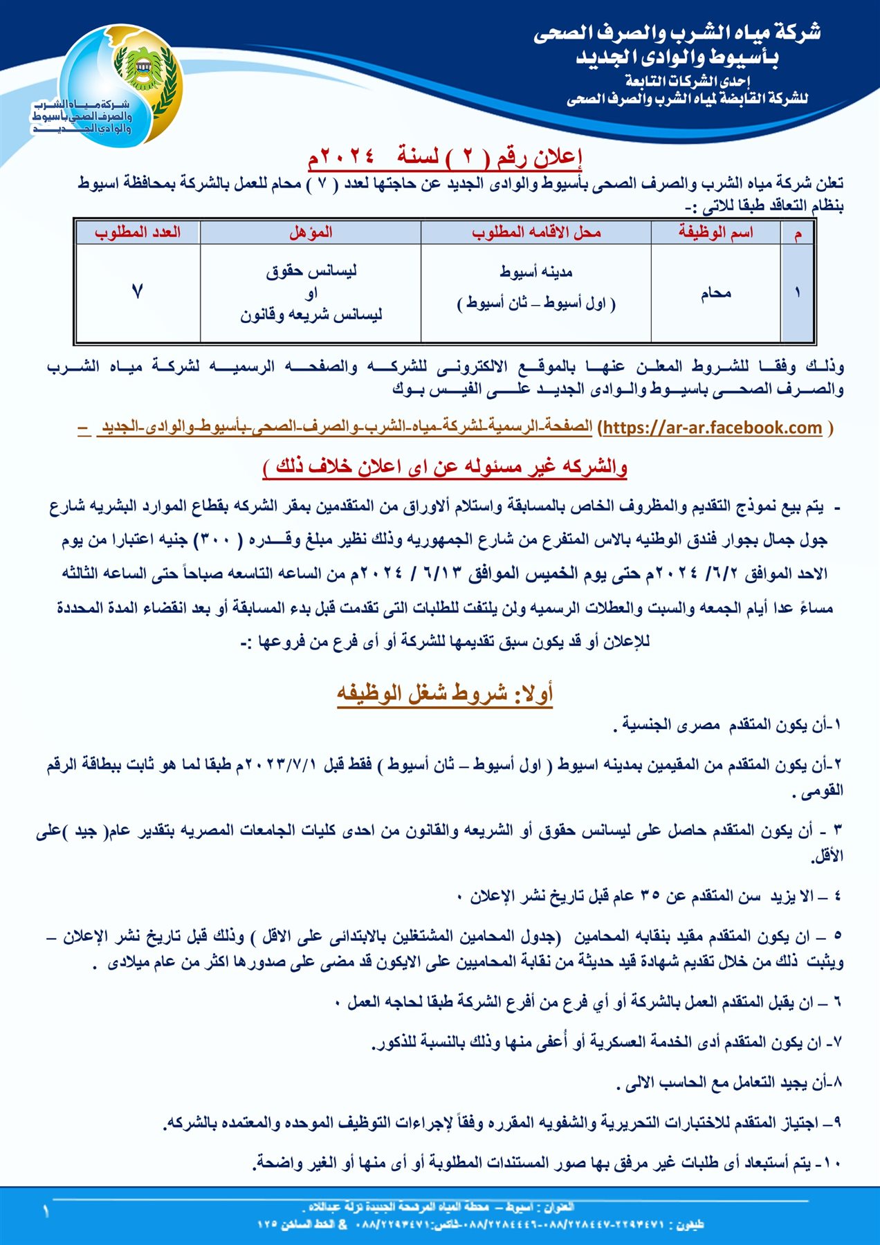 مياه أسيوط تعلن عن حاجتها للتعاقد مع 7محاميين بالإعلان رقم 2