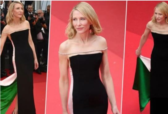 وخطفت كيت بلانشيت عدسات الصحافة والإعلام بإطلالتها التي تعكس تضامنها مع دولة فلسطين، إذ ارتدت فستان طويل مجسم مستوحى من علم فلسطين، برزت فيه ألوان العلم باللون الأحمر والأخضر والأبيض لتنفرد بذوقها بشكل خاص على السجادة الحمراء الشهيرة فى مهرجان كان.