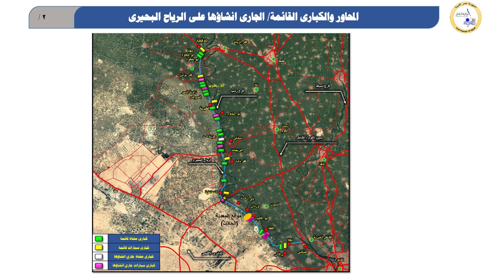 تنفذ وزارة النقل خطة كبرى لالغاء المعديات الخطرة وغير الامنة على الرياحات ومن اهمها الرياح البحيري والرياح الناصري واستبدالها بمحاور مرورية وكبارى سيارات وكبارى مشاه يتم حاليا انشاء عدد 3 محاور مرورية عرضية على هذة الرياحات وهي ( محورالقطا –محور ابوغالب- محور تلا/طنوب) .