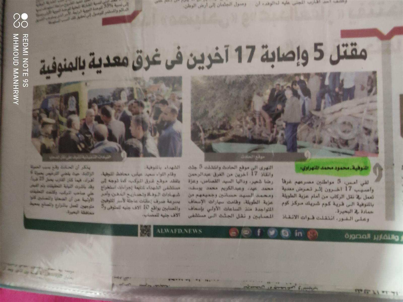 وعلي أثر ذلك نطالب اللواء ابراهيم ابو ليمون محافظ المنوفية، بتوجيه لجان فنية لتلك المعديات حتي يتم التفتيش عن اجراءات السلامة و الصحة ومعرفة من يعمل عليها هل هو مؤهل لذلك اما انه سيهرب عند وقوع حادث، ونكرر تلك النكبة بغرق أطفالنا وشبابنا.