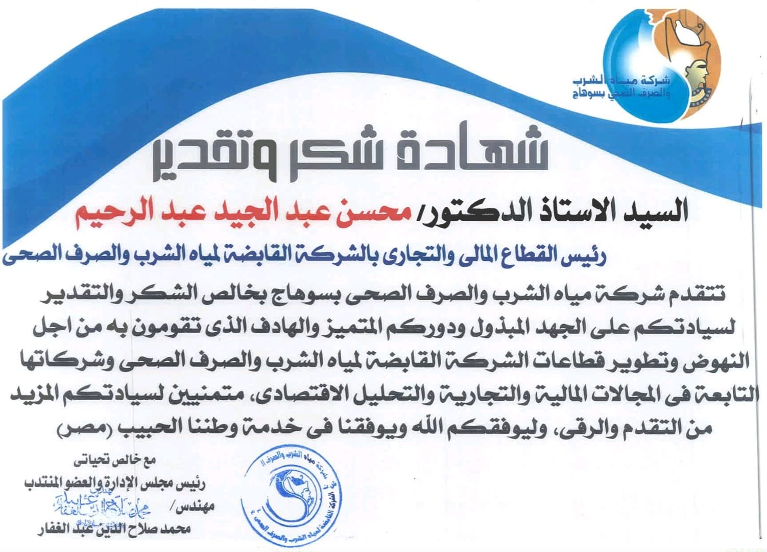 كرم المهندس محمد صلاح الدين عبد الغفار رئيس مجلس ادارة شركة مياه الشرب والصرف الصحى بسوهاج والعضو المنتدب الدكتور محسن عبد الجيد عبد الرحيم رئيس القطاع المالى والتجارى بالشركة القابضة لمياه الشرب والصرف الصحى لمجهوداته فى اعداد تقارير المؤشرات المالية خلال الفترة من 2009 حتى 2022 وكذلك لدوره فى دعم وتطوير القطاع المالى والتجارى والتحليل الاقتصادية بالشركة مما ساهم فى تحقيق أهداف الشركة وتطوير ادائها واستدامة الخدمات المقدمة للمواطنين.