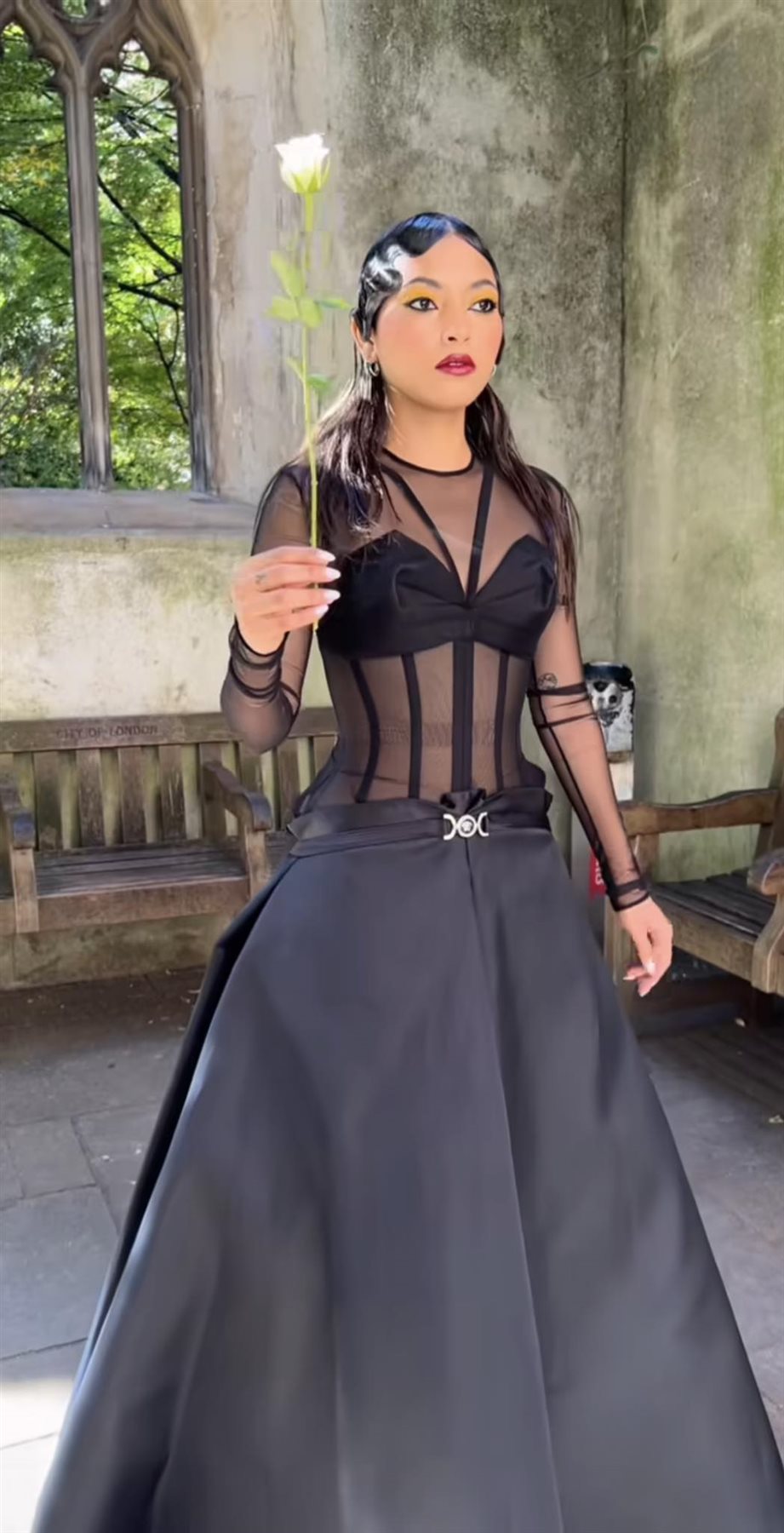 تألقت مي الغيطي بإطلالة جريئة من ماركة Versace وهو تابع لمجموعة خريف 2023، من تصميم الإيطالية دوناتيلا فيرساتشي، مرتدية فستان مصنوع من القماش الشفاف من الجزء العلوي مع بطانة ناحية الصدر فقط، وتنورة سوداء واسعة أسفل منطقة الخصر مثبتة بحزام رفيع مصنوع من الجلد.