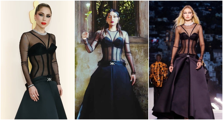 وظهرت قبلها النجمة العالمية ليدي جاجا بنفس الفستان في حفل الأوسكار حيث كانت مرشحة لـ"أفضل أغنية أصلية" عن Hold My Hand من فيلم Top Gun: Maverick، إلا أن الجائزة كانت من نصيب أغنية "Naatu Naatu" الهندية من فيلم "RRR".