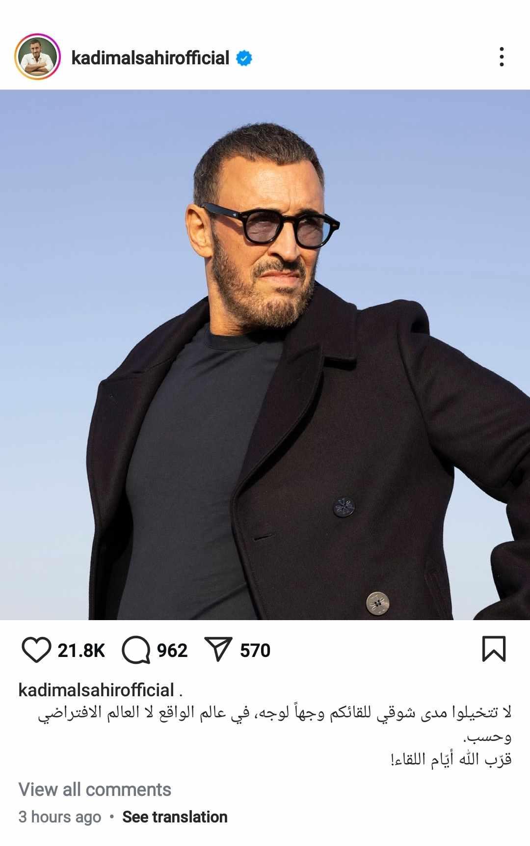 وجه المطرب كاظم الساهر رسالة لجمهوره بجميع أنحاء الوطن العربي، معبرا عن سعادته لرؤية محبيه وجهاً لوجه أثناء جولته الفنية فى مختلف البلدان العربية، قائلاً: قرّب الله أيّام اللقاء، وذلك عبر حسابه الرسمي بموقع تبادل الصور والفيديو "إنستجرام".